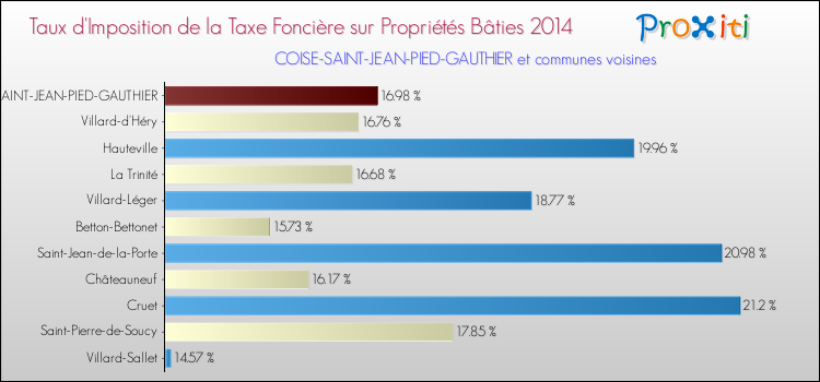 En 2014, le taux de la taxe foncière sur le bâti vôté par le conseil municipal de Coise-Saint-Jean-Pied-Gauthier était de : 16.98 %.