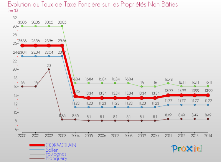 A Cormolain, le taux de taxe foncière sur le non bâti a ainsi baissé de 45.27 % entre 2000 et 2014.