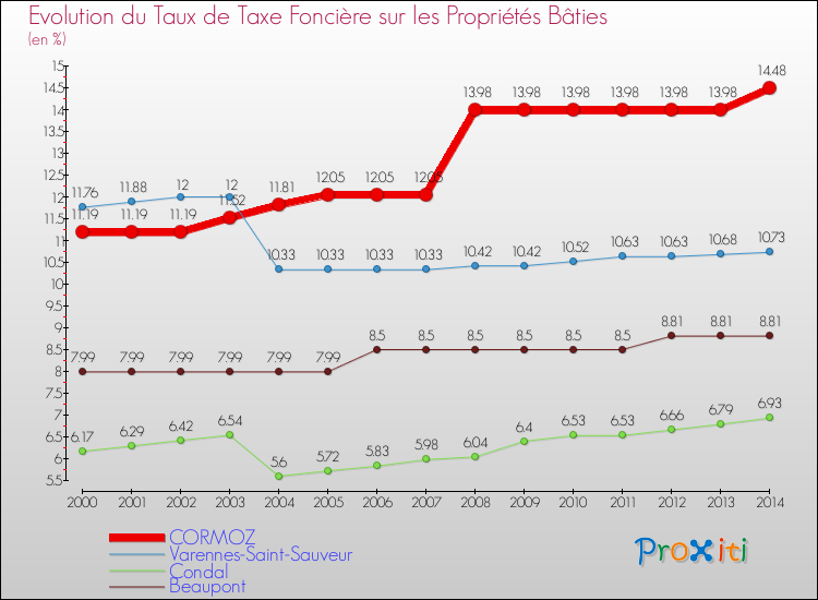En 2014, le taux de la taxe foncière sur le bâti vôté par le conseil municipal de Cormoz était de : 14.48 %.