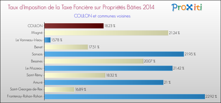 En 2014, le taux de la taxe foncière sur le bâti vôté par le conseil municipal de Coulon était de : 18.23 %.