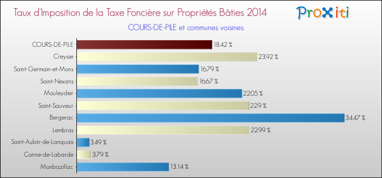 En 2014, le taux de la taxe foncière sur le bâti vôté par le conseil municipal de Cours-de-Pile était de : 18.42 %.