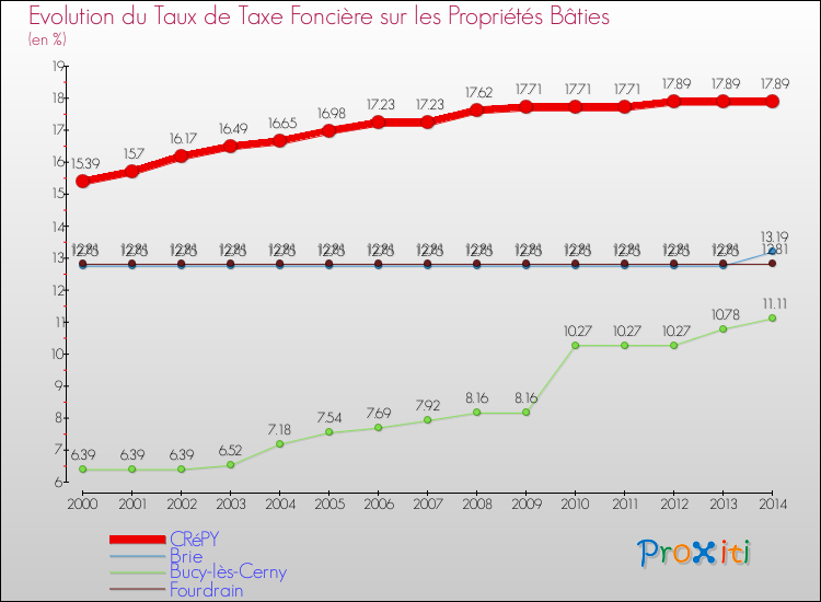 En 2014, le taux de la taxe foncière sur le bâti vôté par le conseil municipal de Crépy était de : 17.89 %.