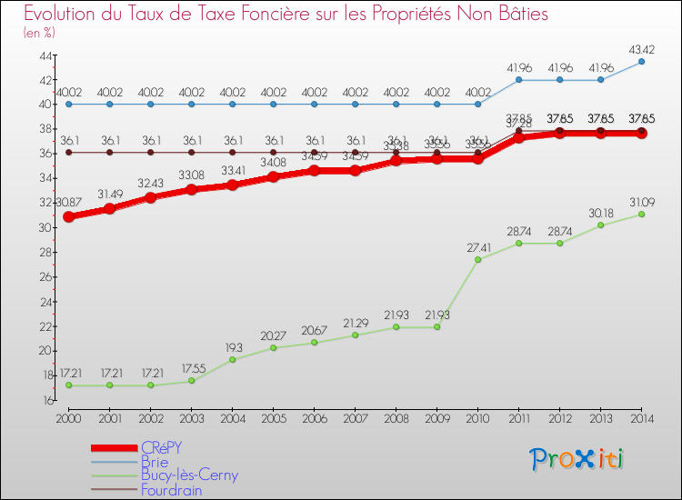 A Crépy, le taux de taxe foncière sur le non bâti a ainsi augmenté de 21.96 % entre 2000 et 2014.