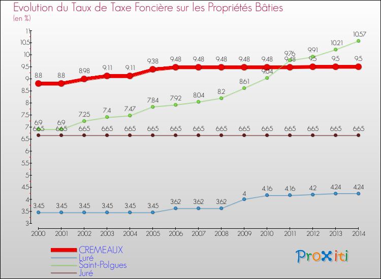 Pendant la même période, les communes françaises similaires à Cremeaux, ont vu leur taux de taxe foncière sur le bâti augmenter de 5.69 % en moyenne entre 2000 et 2014.