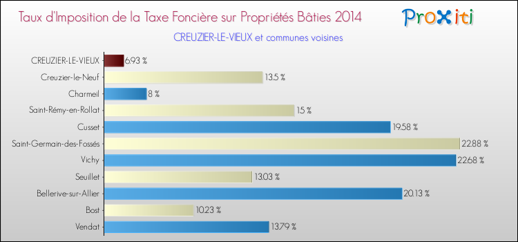 En 2014, le taux de la taxe foncière sur le bâti vôté par le conseil municipal de Creuzier-le-Vieux était de : 6.93 %.