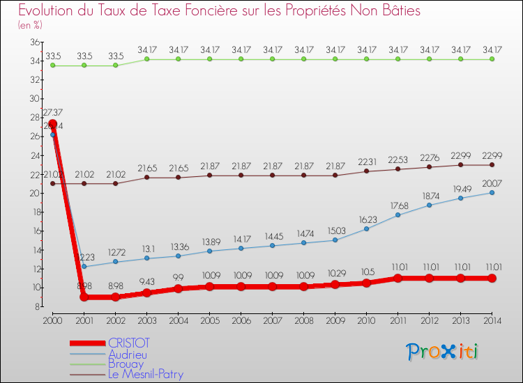 Pendant la même période, les communes françaises similaires à Cristot, ont vu leur taux de taxe foncière sur le non bâti baisser de 19.2 % en moyenne entre 2000 et 2014.