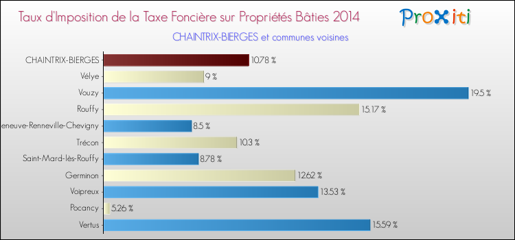 En 2014, le taux de la taxe foncière sur le bâti vôté par le conseil municipal de Chaintrix-Bierges était de : 10.78 %.