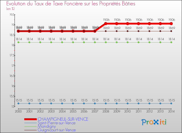 En 2014, le taux de la taxe foncière sur le bâti vôté par le conseil municipal de Champigneul-sur-Vence était de : 19.06 %.