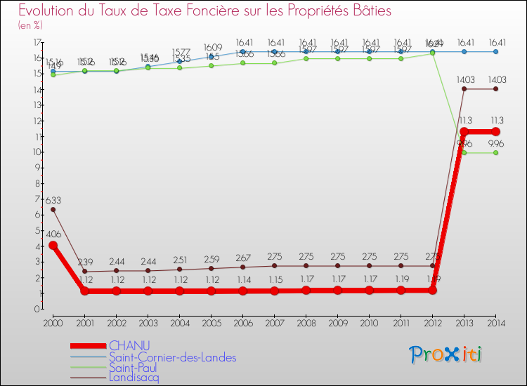 A Chanu, le taux de taxe foncière sur le bâti a donc augmenté de 178.33 % entre 2000 et 2014.