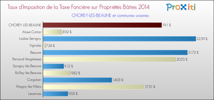 En 2014, le taux de la taxe foncière sur le bâti vôté par le conseil municipal de Chorey-les-Beaune était de : 19.1 %.