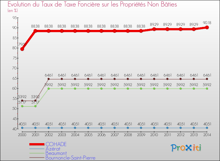 A Cohade, le taux de taxe foncière sur le non bâti a ainsi augmenté de 13.42 % entre 2000 et 2014.