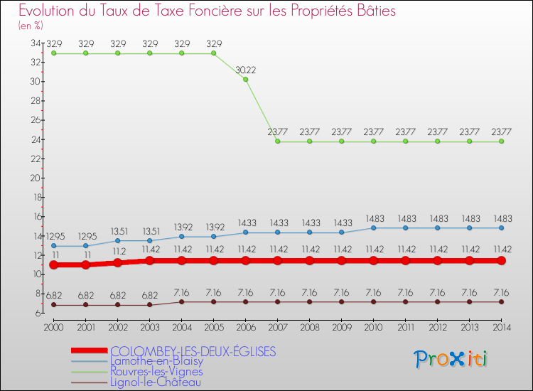 A Colombey-les-Deux-Églises, le taux de taxe foncière sur le bâti a donc augmenté de 3.82 % entre 2000 et 2014.