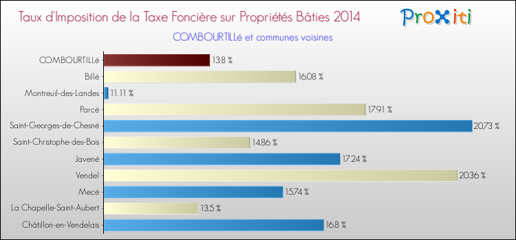 En 2014, le taux de la taxe foncière sur le bâti vôté par le conseil municipal de Combourtillé était de : 13.8 %.