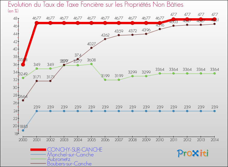 Pendant la même période, les communes françaises similaires à Conchy-sur-Canche, ont vu leur taux de taxe foncière sur le non bâti augmenter de 41.31 % en moyenne entre 2000 et 2014.