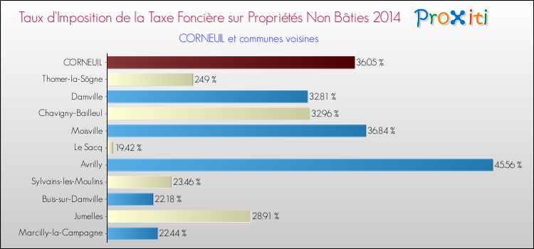 Vous trouverez ci-dessous des graphiques qui vous permettent de situer le taux de la taxe foncière sur le non bâti de Corneuil par rapport aux communes voisines.