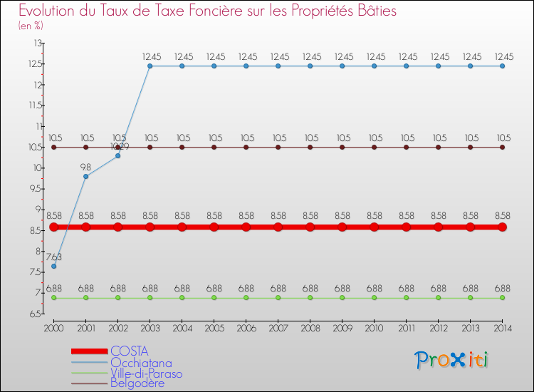 A Costa, le taux de taxe foncière sur le bâti a donc augmenté de 0 % entre 2000 et 2014.
