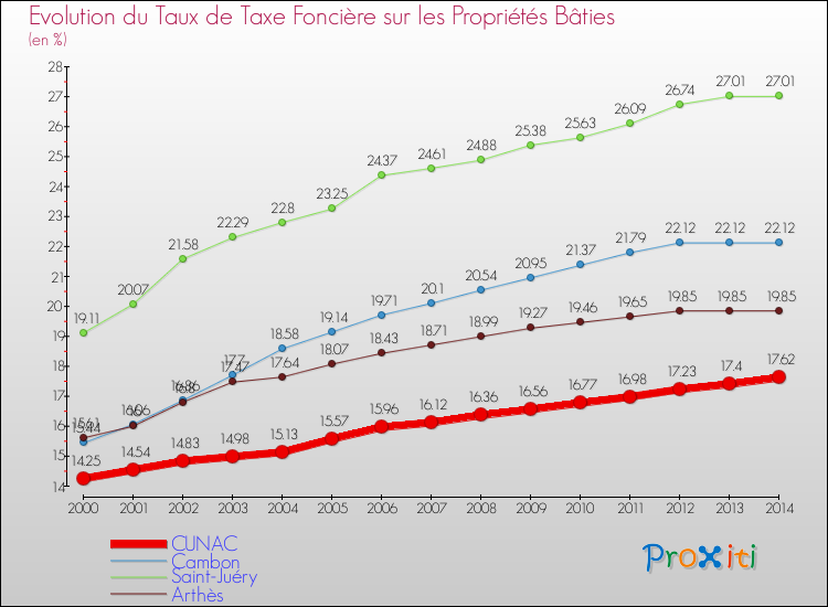 A Cunac, le taux de taxe foncière sur le bâti a donc augmenté de 23.65 % entre 2000 et 2014.