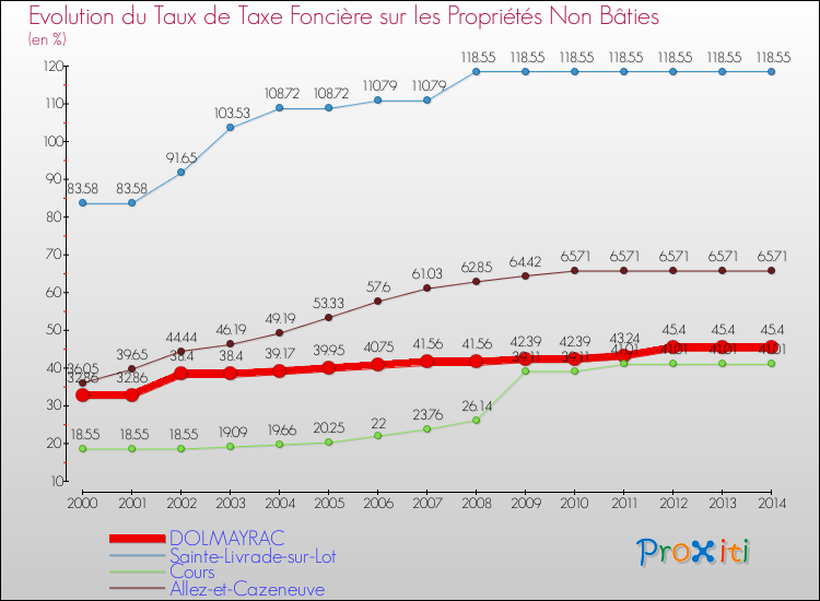 A Dolmayrac, le taux de taxe foncière sur le non bâti a ainsi augmenté de 38.16 % entre 2000 et 2014.