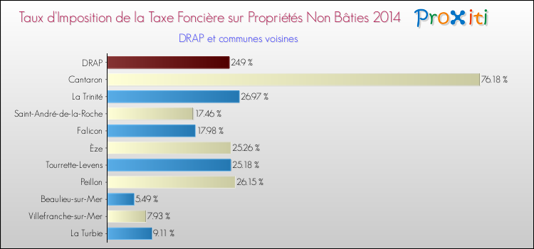 Vous trouverez ci-dessous des graphiques qui vous permettent de situer le taux de la taxe foncière sur le non bâti de Drap par rapport aux communes voisines.