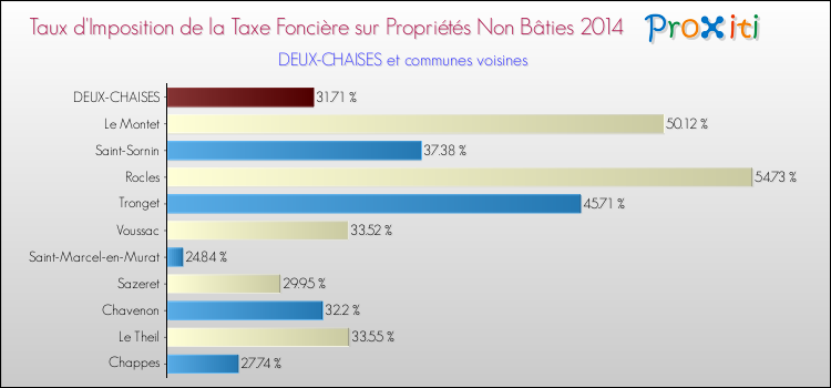 En 2014, le taux de la taxe foncière sur le non bâti vôté par le conseil municipal de Deux-Chaises était de : 31.71 %.