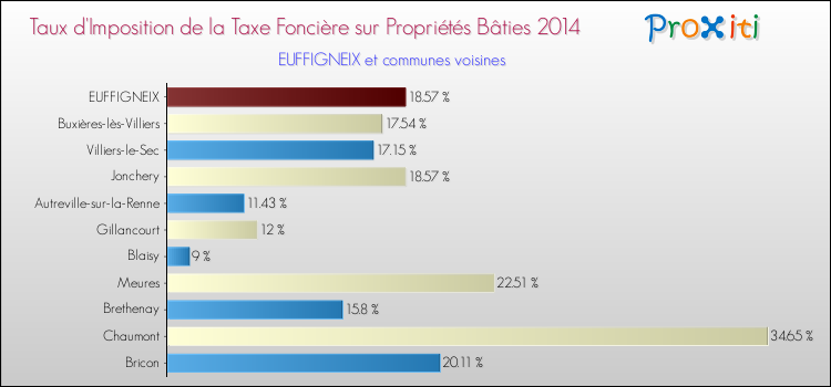 En 2014, le taux de la taxe foncière sur le bâti vôté par le conseil municipal de Euffigneix était de : 18.57 %.