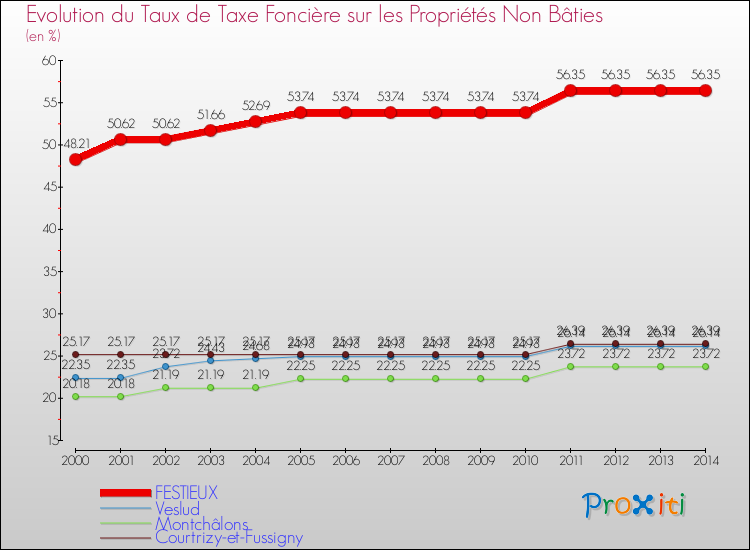 Pendant la même période, les communes françaises similaires à Festieux, ont vu leur taux de taxe foncière sur le non bâti augmenter de 24.79 % en moyenne entre 2000 et 2014.