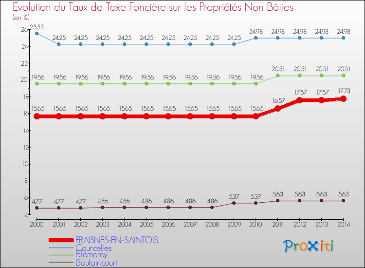 A Fraisnes-en-Saintois, le taux de taxe foncière sur le non bâti a ainsi augmenté de 13.29 % entre 2000 et 2014.