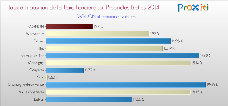A noter : la valeur moyenne de ce taux de taxe foncière sur le bâti dans les communes françaises similaires à Fagnon était de 14.2 %, en 2014.
