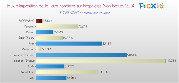 En 2014, le taux de la taxe foncière sur le non bâti vôté par le conseil municipal de Florensac était de : 53.34 %.