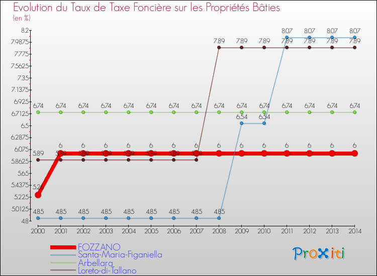 A Fozzano, le taux de taxe foncière sur le bâti a donc augmenté de 14.07 % entre 2000 et 2014.