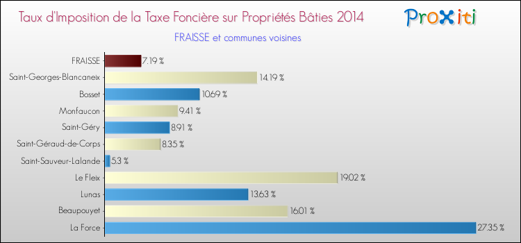 En 2014, le taux de la taxe foncière sur le bâti vôté par le conseil municipal de Fraisse était de : 7.19 %.