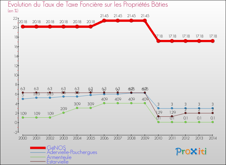 Pendant la même période, les communes françaises similaires à Génos, ont vu leur taux de taxe foncière sur le bâti baisser de 9.31 % en moyenne entre 2000 et 2014.