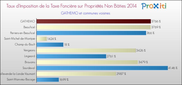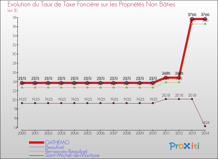 Pendant la même période, les communes françaises similaires à Gathemo, ont vu leur taux de taxe foncière sur le non bâti augmenter de 42.05 % en moyenne entre 2000 et 2014.