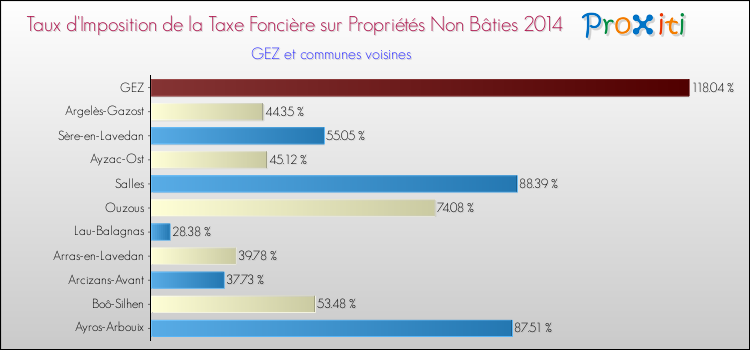 En 2014, le taux de la taxe foncière sur le non bâti vôté par le conseil municipal de Gez était de : 118.04 %.
