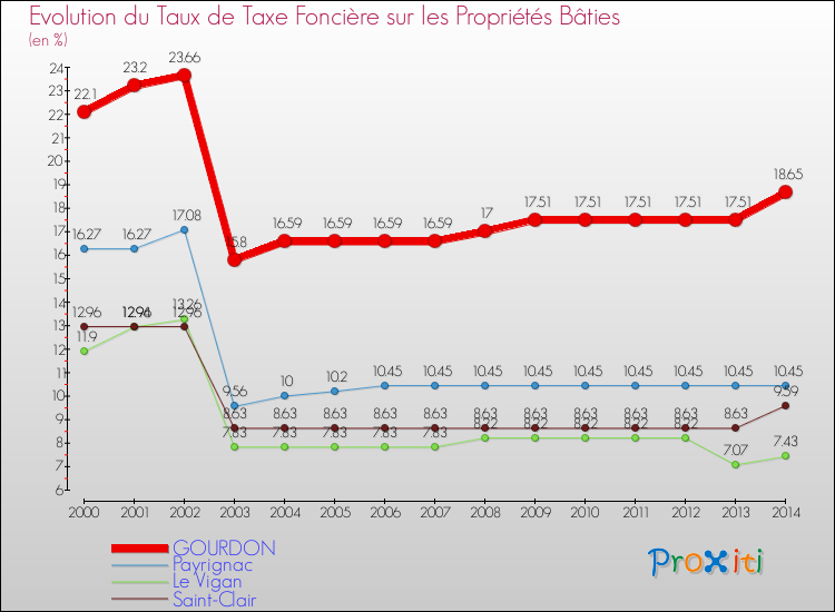 Pendant la même période, les communes françaises similaires à Gourdon, ont vu leur taux de taxe foncière sur le bâti augmenter de 1 % en moyenne entre 2000 et 2014.
