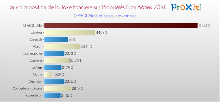 En 2014, le taux de la taxe foncière sur le non bâti vôté par le conseil municipal de Gréolières était de : 114.41 %.