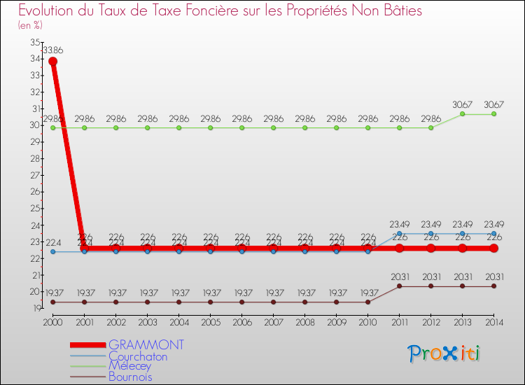 Pendant la même période, les communes françaises similaires à Grammont, ont vu leur taux de taxe foncière sur le non bâti augmenter de 41.31 % en moyenne entre 2000 et 2014.