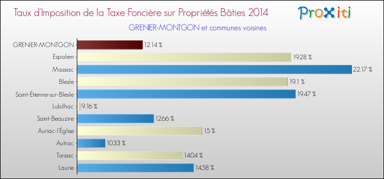 Vous trouverez ci-dessous des graphiques qui vous permettent de situer le taux de la taxe foncière sur le bâti de Grenier-Montgon par rapport aux communes voisines.