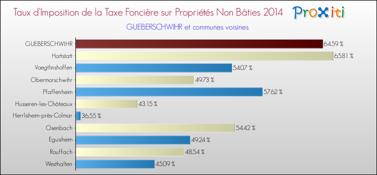 En 2014, le taux de la taxe foncière sur le non bâti vôté par le conseil municipal de Gueberschwihr était de : 64.59 %.