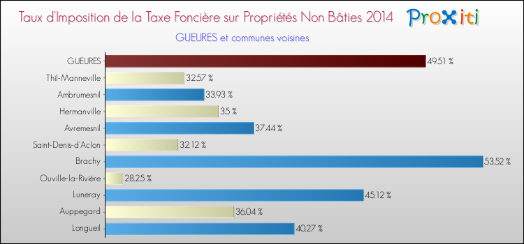 Vous trouverez ci-dessous des graphiques qui vous permettent de situer le taux de la taxe foncière sur le non bâti de Gueures par rapport aux communes voisines.