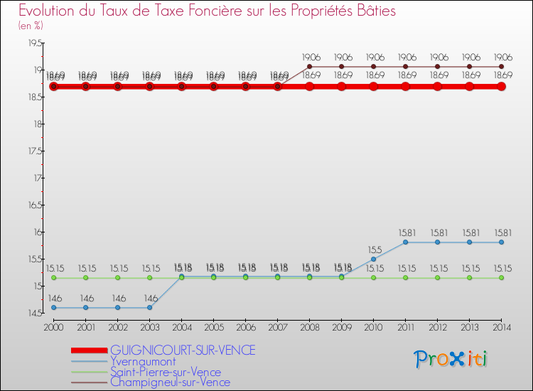En 2014, le taux de la taxe foncière sur le bâti vôté par le conseil municipal de Guignicourt-sur-Vence était de : 18.69 %.