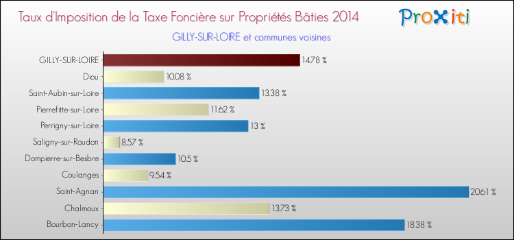 En 2014, le taux de la taxe foncière sur le bâti vôté par le conseil municipal de Gilly-sur-Loire était de : 14.78 %.