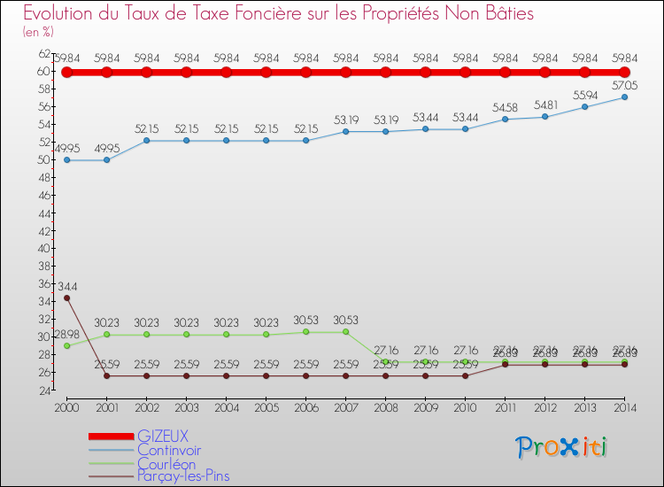 En 2014, le taux de la taxe foncière sur le non bâti vôté par le conseil municipal de Gizeux était de : 59.84 %.