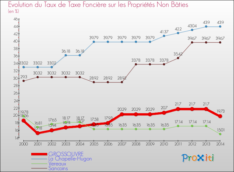En 2014, le taux de la taxe foncière sur le non bâti vôté par le conseil municipal de Grossouvre était de : 19.73 %.