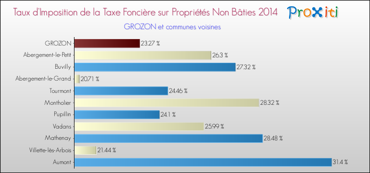 Vous trouverez ci-dessous des graphiques qui vous permettent de situer le taux de la taxe foncière sur le non bâti de Grozon par rapport aux communes voisines.