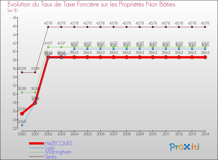 Pendant la même période, les communes françaises similaires à Hézecques, ont vu leur taux de taxe foncière sur le non bâti augmenter de 41.31 % en moyenne entre 2000 et 2014.