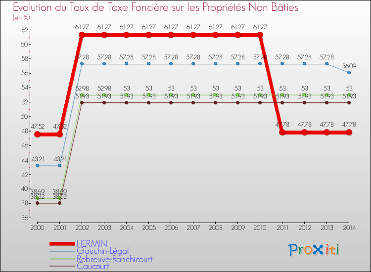 Pendant la même période, les communes françaises similaires à Hermin, ont vu leur taux de taxe foncière sur le non bâti augmenter de 48.47 % en moyenne entre 2000 et 2014.