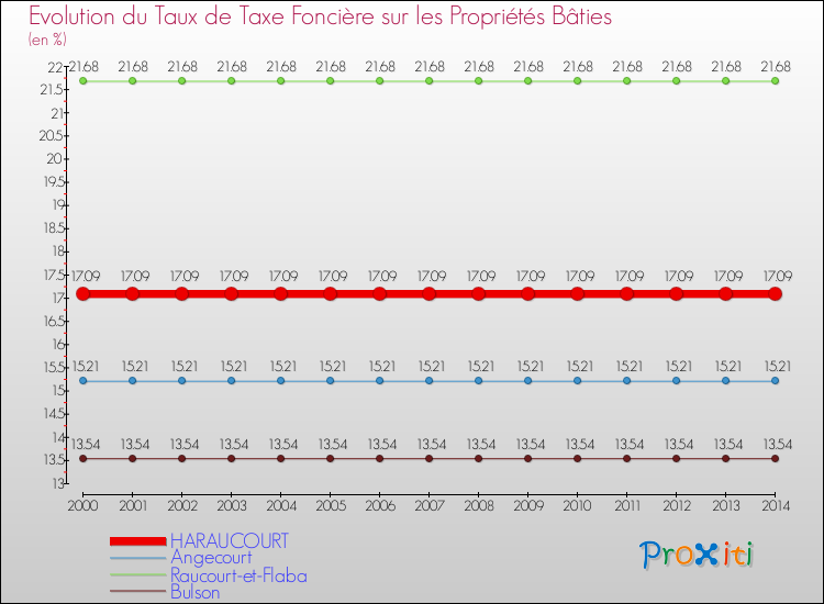 A Haraucourt, le taux de taxe foncière sur le bâti a donc augmenté de 0 % entre 2000 et 2014.
