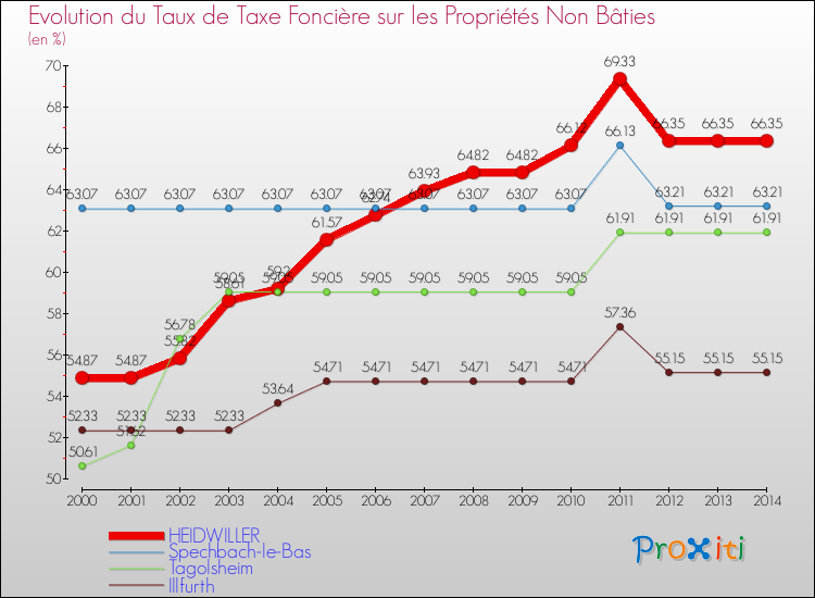 Pendant la même période, les communes françaises similaires à Heidwiller, ont vu leur taux de taxe foncière sur le non bâti augmenter de 9.43 % en moyenne entre 2000 et 2014.