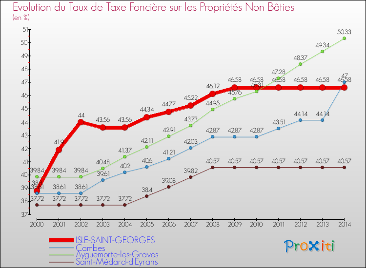 Pendant la même période, les communes françaises similaires à Isle-Saint-Georges, ont vu leur taux de taxe foncière sur le non bâti augmenter de 13.27 % en moyenne entre 2000 et 2014.